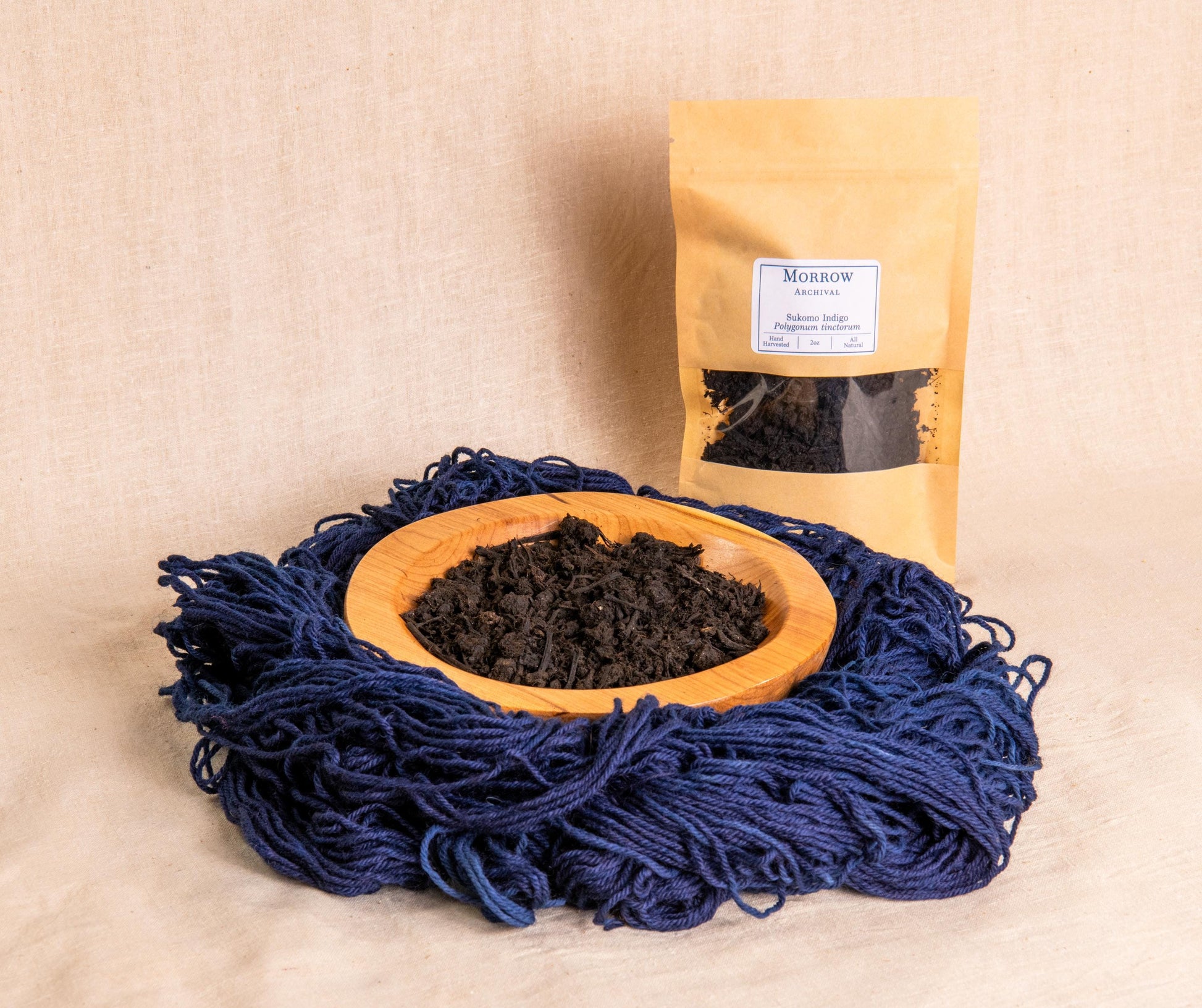 Use in a fermentation vat or reduced vat with an alkaline agent (such as wood ash lye, soda ash, or lime) and a reducing agent (like fructose, madder root, or thiourea dioxide). Works beautifully with multiple dips to build up color and fastness. Ideal for cotton, linen, silk, and wool. Sukumo excels in resist dyeing (katazome, shibori) and traditional stencil work.